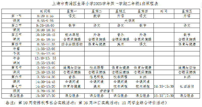 上海市青浦区金泽小学2025学年第一学期三年级1班课程表
