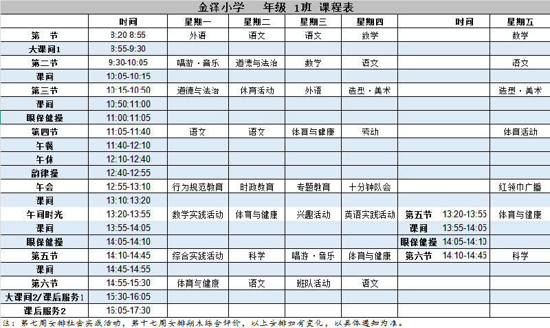 上海市青浦区金泽小学2025学年第二学期一年级1班课程表