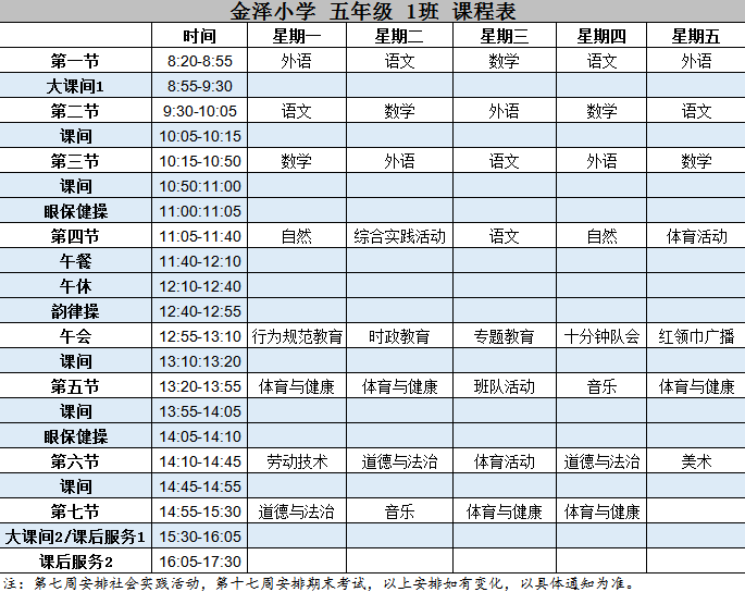 上海市青浦区金泽小学2025学年第二学期五年级1班课程表